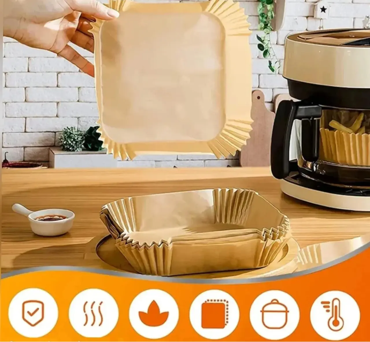 Papierová forma je vyrobená zo silikónového papiera a chráni kôš teplovzdušnej fritézy pred zvyškami jedla, olejovými škvrnami a škrabancami. Predĺži životnosť spotrebiča, uľahčí čistenie a údržbu , obzvlášť pri príprave hranolčekov, vyprážaných krídeliek a iných dobrôt... Kôš sa pri použití papiera ľahšie čistí, netreba ho drhnúť, čím sa predlžuje jeho životnosť. Papier chráni jedlo pred prilepením, čím robí pripravované jedlo chutnejšie a minimalizuje straty jedla. Vhodná aj do mikrovlnnej rúry, parného hrnca, panvice a pod. Ideálna na prípravu koláčov, zeleniny, cestovín, diétnych jedál doma, na chalupe či v záhrade pri grilovaní. Je určená pre teploty do +230 °C. Je vodotesná, nelepivá, ľahká, skladná, veľmi praktická a navyše nijak neovplyvňuje chuť pripravovaného jedla.